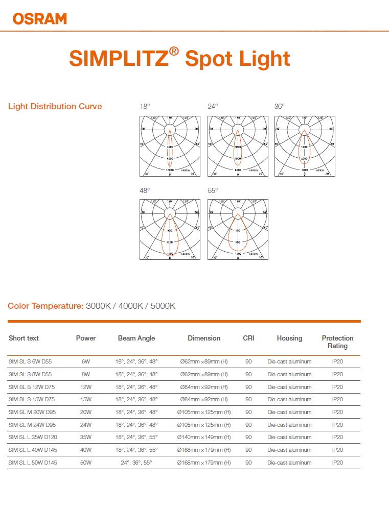 - Beam angle 18°, 24°, 36°, 48°, 55°