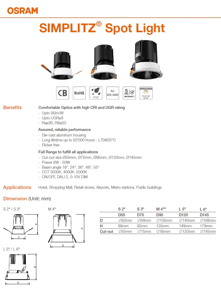 - Cut-out size Ø55mm, Ø75mm, Ø95mm, Ø120mm, Ø145mm