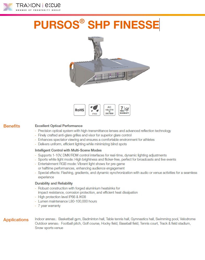 Applications: Indoor arenas:Basketball gym, Badminton hall, Table tennis hall, Gymnastics hall, Swimming pool, Velodrome Outdoor arenas:Football pitch, Golf course, Hocky field, Baseball field, Tennis court, Track & field stadium, Snow sports venue