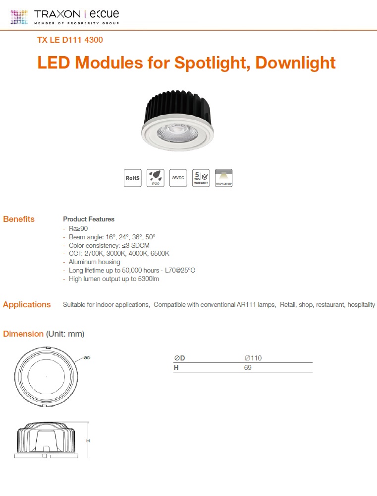Applications: Suitable for indoor applications, Compatible with conventional AR111 lamps, Retail, shop, restaurant, hospitality
